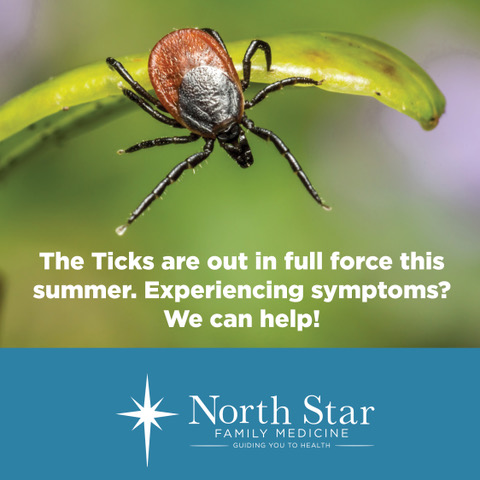 Use tweezers to grasp the tick by the head and pull straight up. Don’t crush or squeeze the tick. If you don’t think you can remove the tick safely at home, book an appointment with North Star Family Medicine and we can remove it for you.